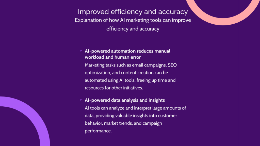 - Efficiency Enhancement: AI-driven marketing tools can automate monotonous marketing activities, such as email campaigns, social media updates, and content production, allowing marketers to concentrate on other aspects like strategy and inventive content development.