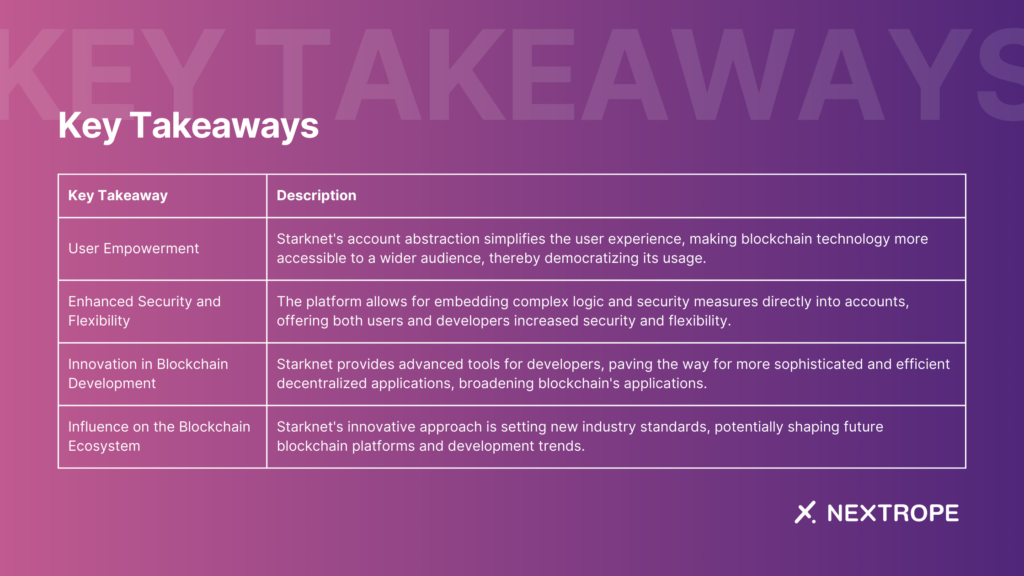 • Setting a New Standard. As more users and developers experience the benefits of account abstraction on Starknet, it could set a new standard for user experience and functionality in blockchain platforms, influencing future blockchain developments.