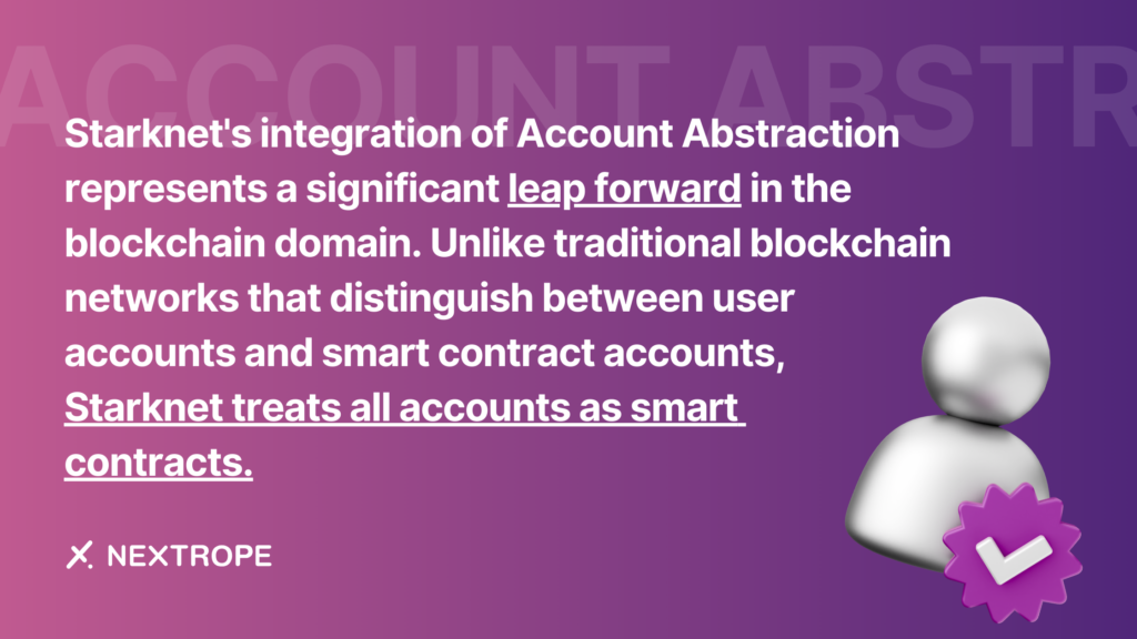 Starknet's integration of Account Abstraction represents a significant leap forward in the blockchain domain. Unlike traditional blockchain networks that distinguish between user accounts and smart contract accounts, Starknet treats all accounts as smart contracts. This approach not only streamlines the user experience but also enhances the network's flexibility and functionality.