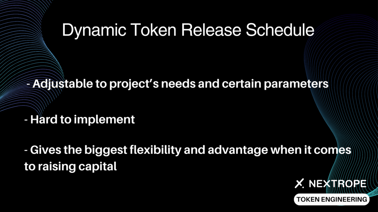 A dynamic token release schedule represents a flexible and adaptive approach to token distribution. Unlike static models, this schedule can adjust the rate of token release based on specific criteria. Example criteria are: project’s milestones, market conditions, or the behavior of token holders. This responsiveness is designed to offer a balanced strategy that can react to the project's needs in real-time.