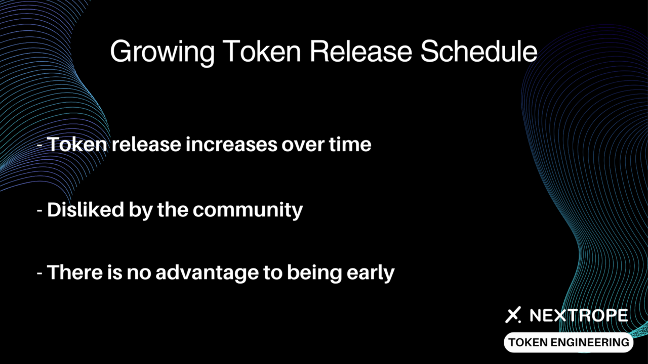 A growing token release schedule turns the dial up on token distribution as time progresses. This schedule is designed to increase the number of tokens released to the market or to stakeholders with each passing period. This approach can often be associated with incentivizing the sustained growth of the project by rewarding long-term holders.
