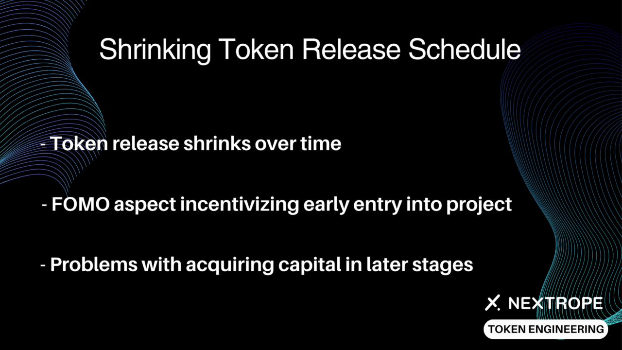 In contrast to a linear schedule, a growing token release schedule adds a strategic twist that favors the longevity of stakeholder engagement. It's a model that can create a solid foundation for future growth but requires careful communication and management to keep stakeholders satisfied. Up next, we will look at the shrinking token release schedule, which applies an opposite approach to distribution.