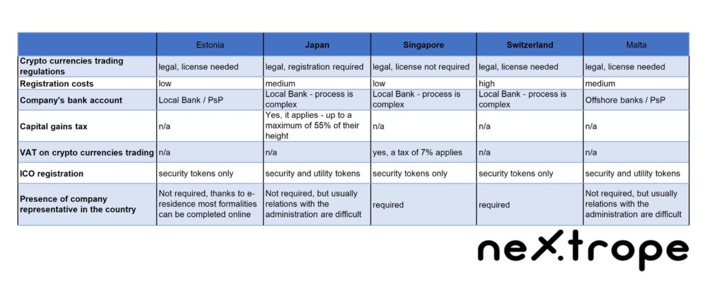 Below is a comparison of jurisdictions popular among crypto entrepreneurs: