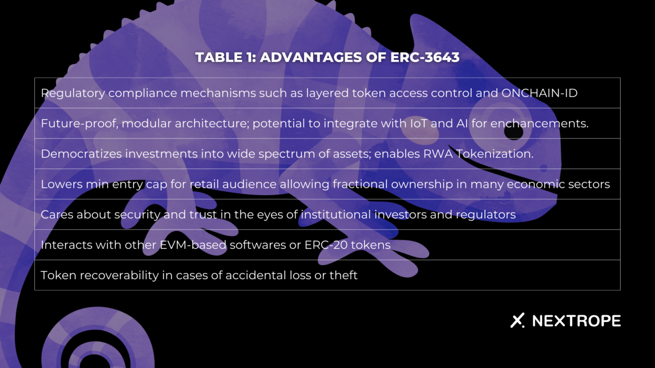 • ERC-3643 offers enhanced security through multi-level permissions, global applicability, and integration with existing systems. It also enables the integration of blockchain with AI tools for optimized operations.