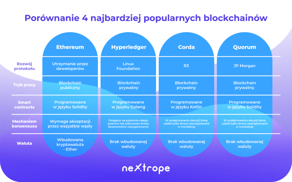 Zainteresowałeś się Blockchainem, a teraz zastanawiasz się jak sprawdziłby się on w Twoim modelu biznesowym? Bez wątpienia jest to technologia, która w ciągu ostatnich kilku lat ciągle zyskuje popularność, a rozwiązania na niej oparte znajdziemy już w tak różnorodnych branżach jak nieruchomości i rozrywki. Wśród firm obecnych na AngelList blisko 3 tysiące wykorzystuje Blockchain. Na blogu Nextrope staramy się wyjaśnić kluczowe kwestie z nim związane oraz przedstawić obszary, w których jego zastosowanie mogłoby okazać się korzystne. W tym artykule zajęliśmy się porównaniem najbardziej popularnych protokołów: Ethereum, Hyperledger Fabric, Corda i Quorum.