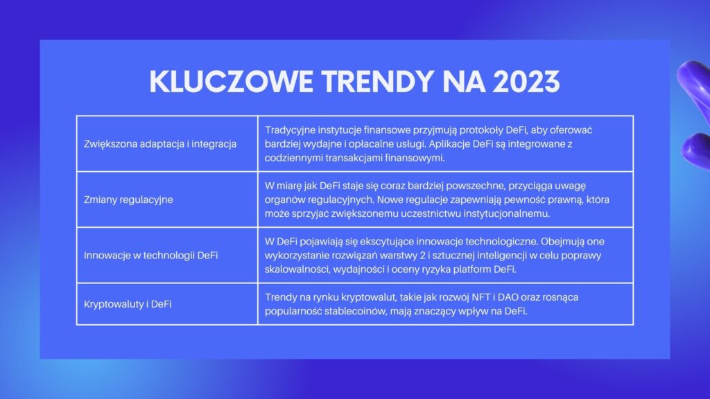 Patrząc w przyszłość DeFi po 2023 roku, można dokonać kilku kluczowych prognoz w oparciu o obecne trendy i wydarzenia: