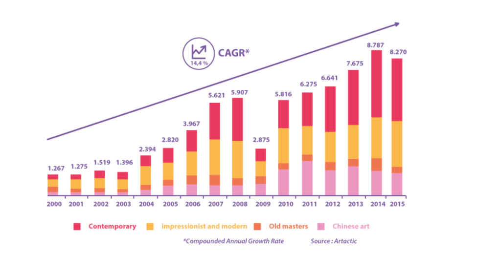 W 2018 roku sprzedaż na światowym rynku sztuki sięgnęła 67 miliardów dolarów. Co oznacza wzrost o 6,3% w stosunku do 2017 roku i 12% w porównaniu z rokiem 2016. Od lat pod względem wartości najważniejszym sektorem pozostaje sztuka powojenna i współczesna. W ciągu ostatnich 20 lat dzieła z tych okresów przyniosły złożony roczny zwrot (CAR) przewyższający o 10,7% całkowity zwrot S&P. Jednak rosnący rynek sztuki pozostaje wysoce niepłynny i tak jak w przypadku samochodów kolekcjonerskich, dostępny tylko dla ograniczonej liczby zamożnych osób i instytucji.